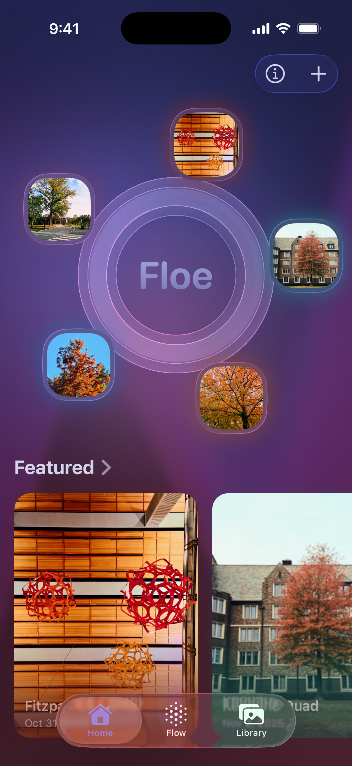 Floe is a native iOS photo journal that reimagines photography in accent, composition, and mood. The app is designed to gently look into photos and surface the subtle qualities that make them emotionally resonant. Using Vision, Core Image, and custom algorithms, Floe analyzes composition, accent colors, warmth, and energy, while the System Language Model generates tailored reflections. Floe presents optics insights in an elegant, continuous scroll that tracks the flow of mood over time. Built entirely in SwiftUI with native navigation patterns, dynamic color adaptation, and thoughtful haptics, Floe's design and implementation are crafted to reflect a deeply personal approach to storytelling through images.
